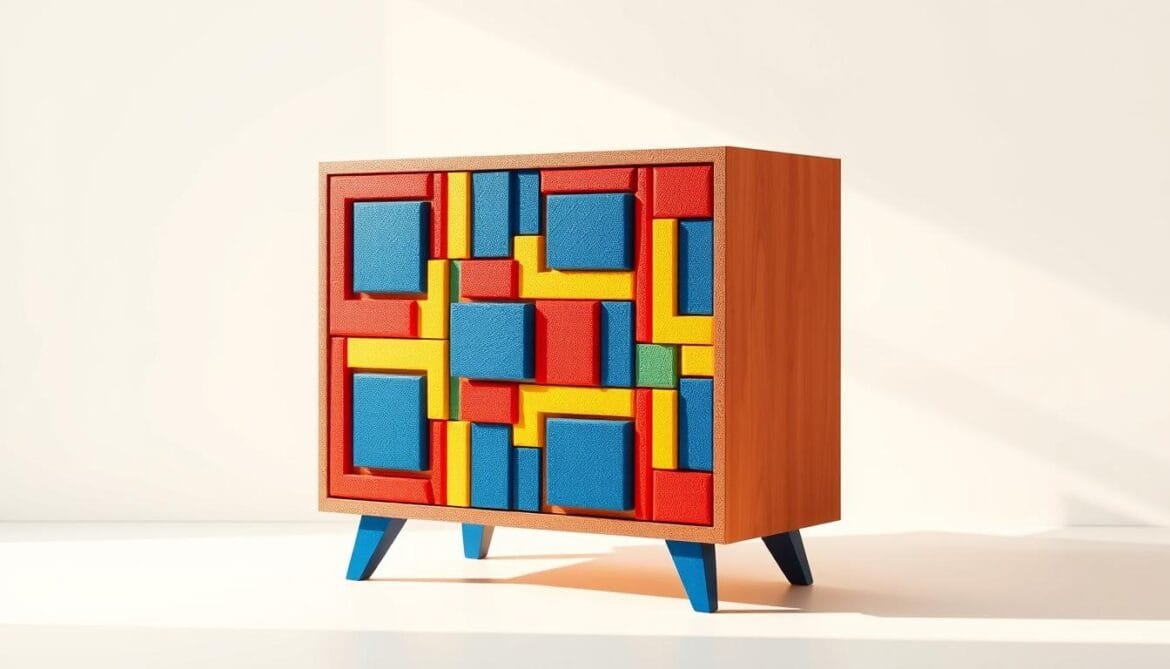 Der Memphis-Style ist ein farbenfroher und geometrischer Stil. Er ist ideal für das Upcycling von Kommoden. Nutzen Sie farbenfrohe und geometrische Muster, wie Streifen oder Punkte.