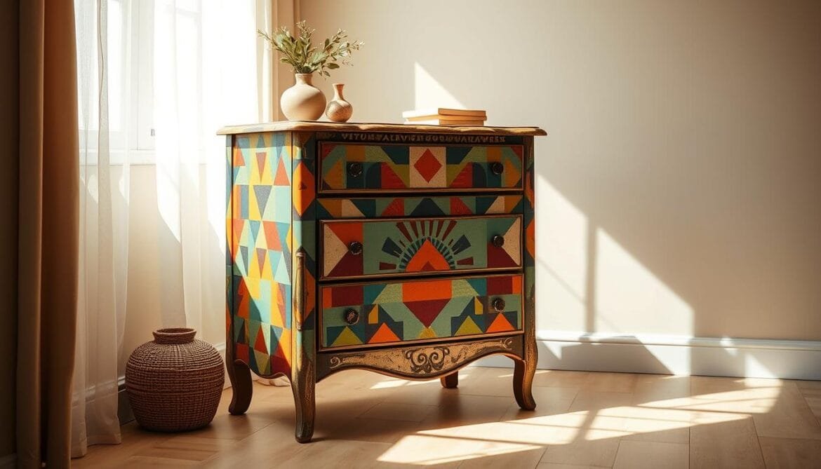 - Schablonierung und Handmalerei, um Muster und Designs auf die Oberfläche der Kommode aufzutragen